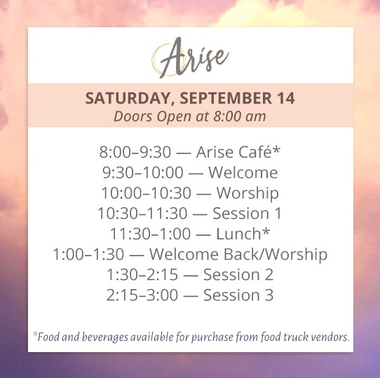 Arise is a FREE event for women who love Jesus to come together for worship, praise, prayer and teaching. The day will start with corporate worship before transitioning into messages from our speakers. During breaks, guests are encouraged to fellowship with one another. It’s a day to fill your cup with other sisters in Christ! Come and be filled!